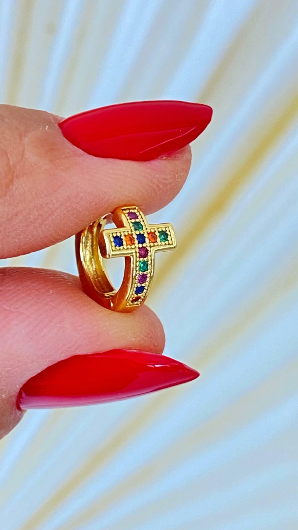 Essas argolinhas são o acessório perfeito para quem busca um toque de sofisticação e brilho. Com um design encantador em formato de cruz, elas são cravejadas com zircônios coloridos que capturam a luz de maneira deslumbrante.